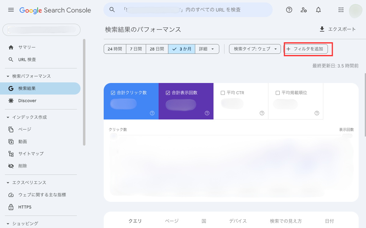 検索キーワードや検索順位は「検索パフォーマンス>検索結果」から確認できます。デフォルトでは、サイト全体の3ヶ月間の検索パフォーマンスが閲覧できるようになっています。