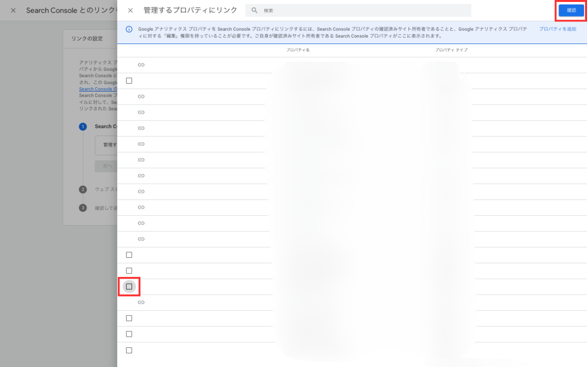 - ログイン中のGoogleアカウントに紐付けられているサーチコンソールのプロパティが表示されるため、該当のプロパティを選択して「確認」をクリック