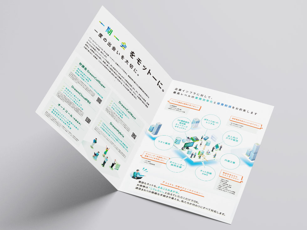 - 東京の浅草にある通信インフラをご提案されている株式会社ドリームソリューション様の会社案内制作を担当いたしました。