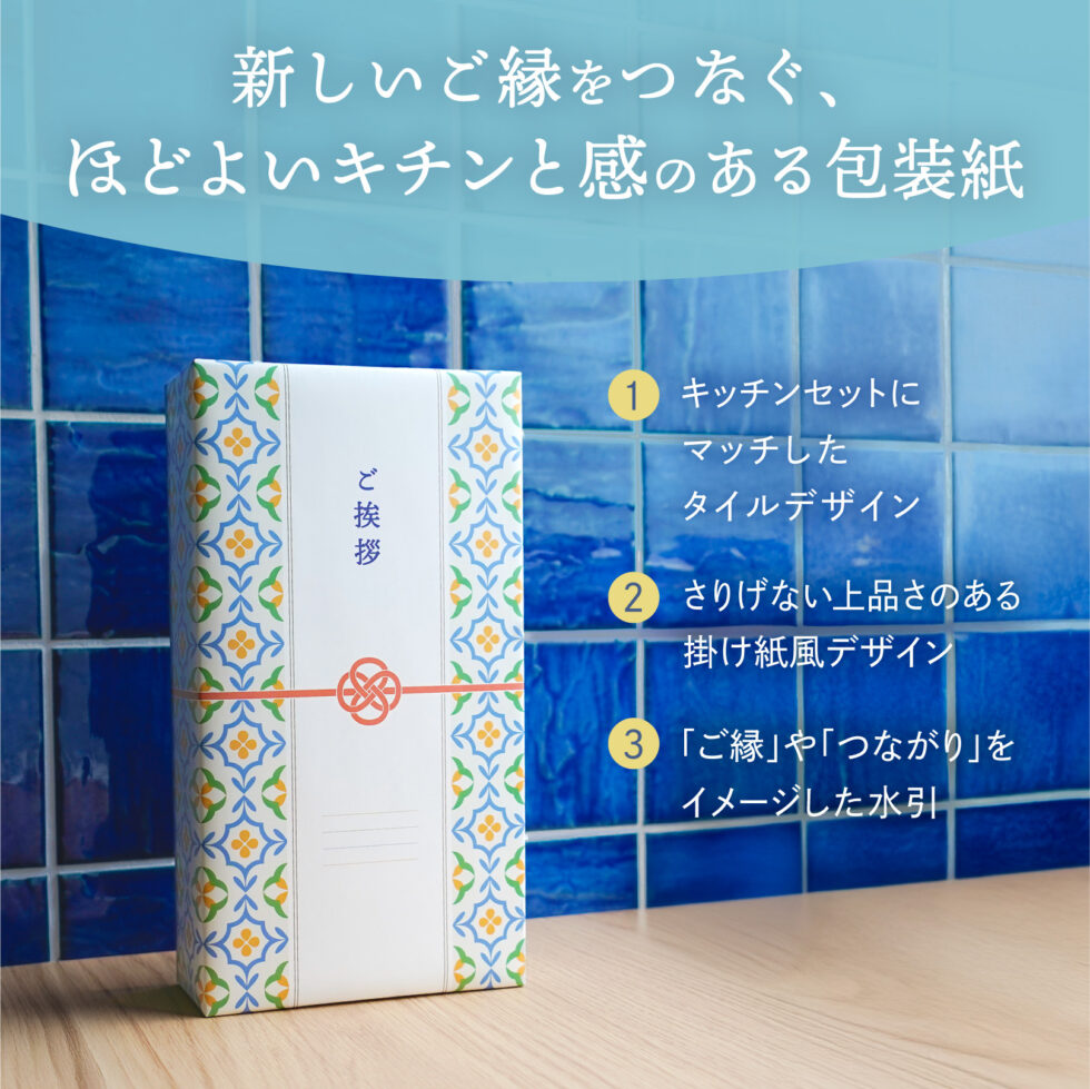 ・中身のキッチンセットにマッチしたおしゃれなタイルデザイン。「ご縁」や「つながり」を意味するケルティックノットモチーフの水引で、新しいご縁がつながるよう、願いを込めています。