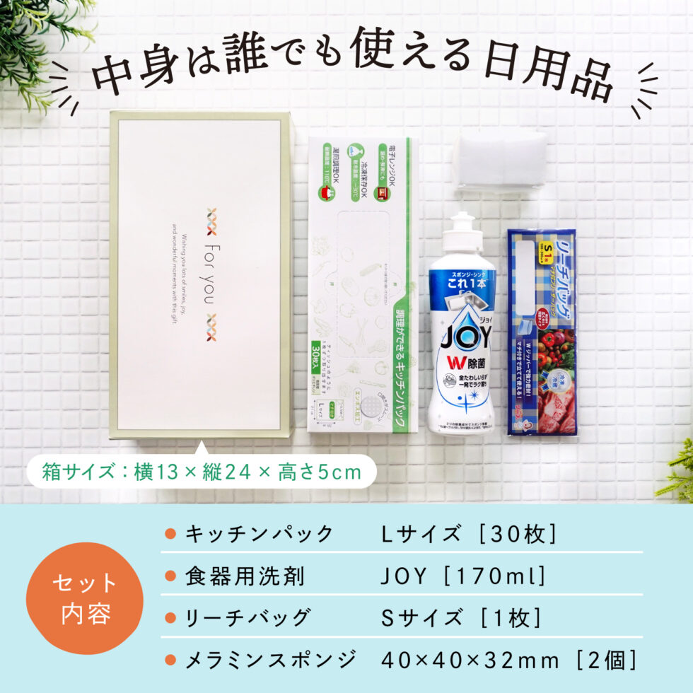 ・「キッチンパック」と食器用洗剤「JOY(ジョイ)」、「リーチバッグ」、「メラミンスポンジ(2個)」が入っていてボリュームたっぷり。